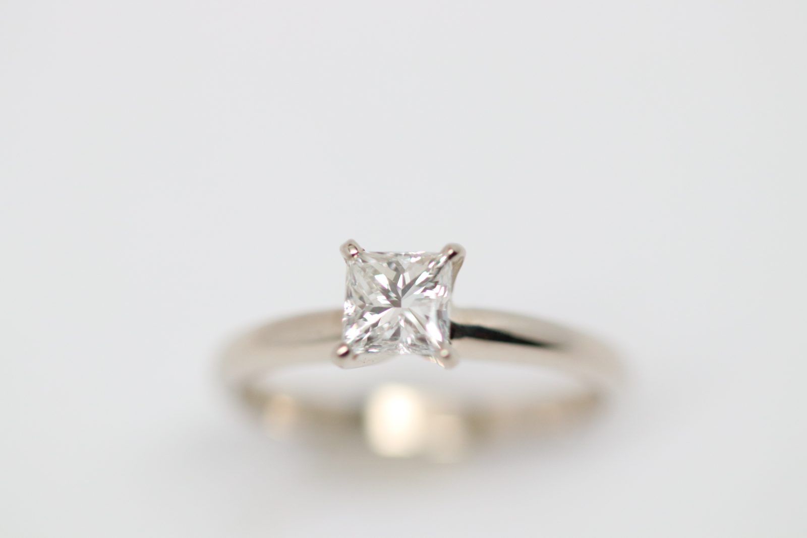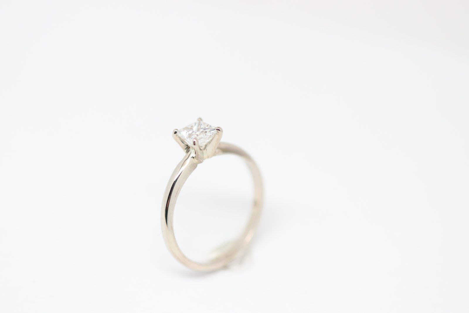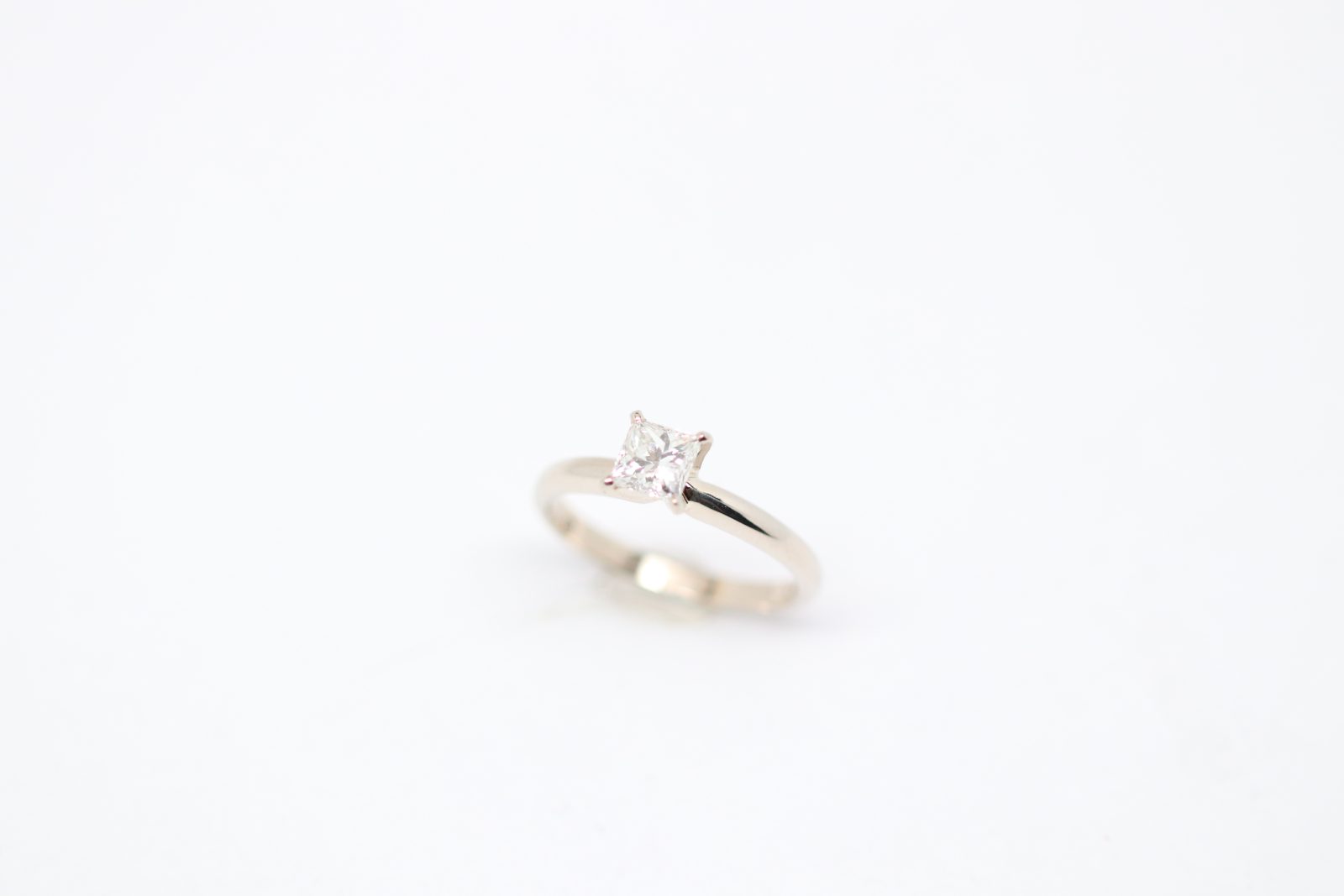 Sleek and sophisticated, this 14 karat white gold solitaire engagement ring showcases a 0.70 carat princess-cut diamond graded G color and VS1 clarity. The crisp square silhouette of the princess cut delivers exceptional brilliance with clean, modern lines.