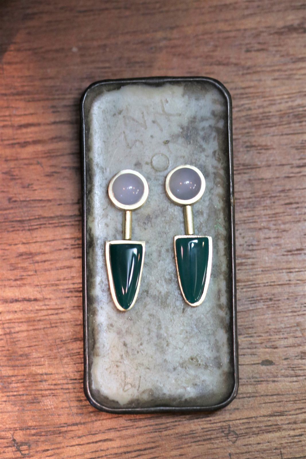 Elegant and eye-catching, these 18 karat yellow gold drop earrings feature two elongated 8 x 16 mm green onyx gemstones, beautifully complemented by two 8 x 8 mm moonstones. The rich, vibrant green onyx offers a bold pop of color, while the luminous moonstones add a soft, ethereal glow. Suspended in warm yellow gold, this refined combination creates a striking balance of depth and light—perfect for both everyday sophistication and special occasions.