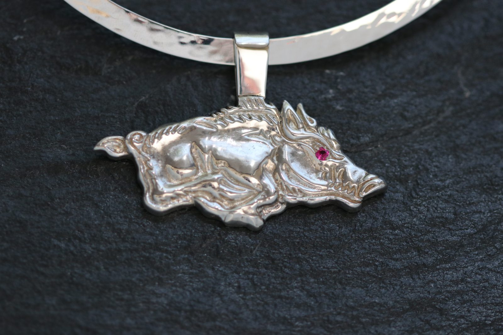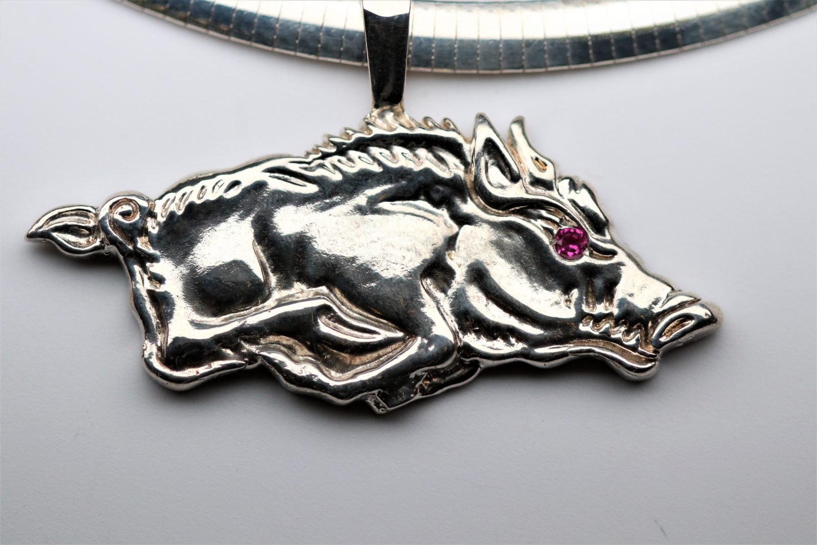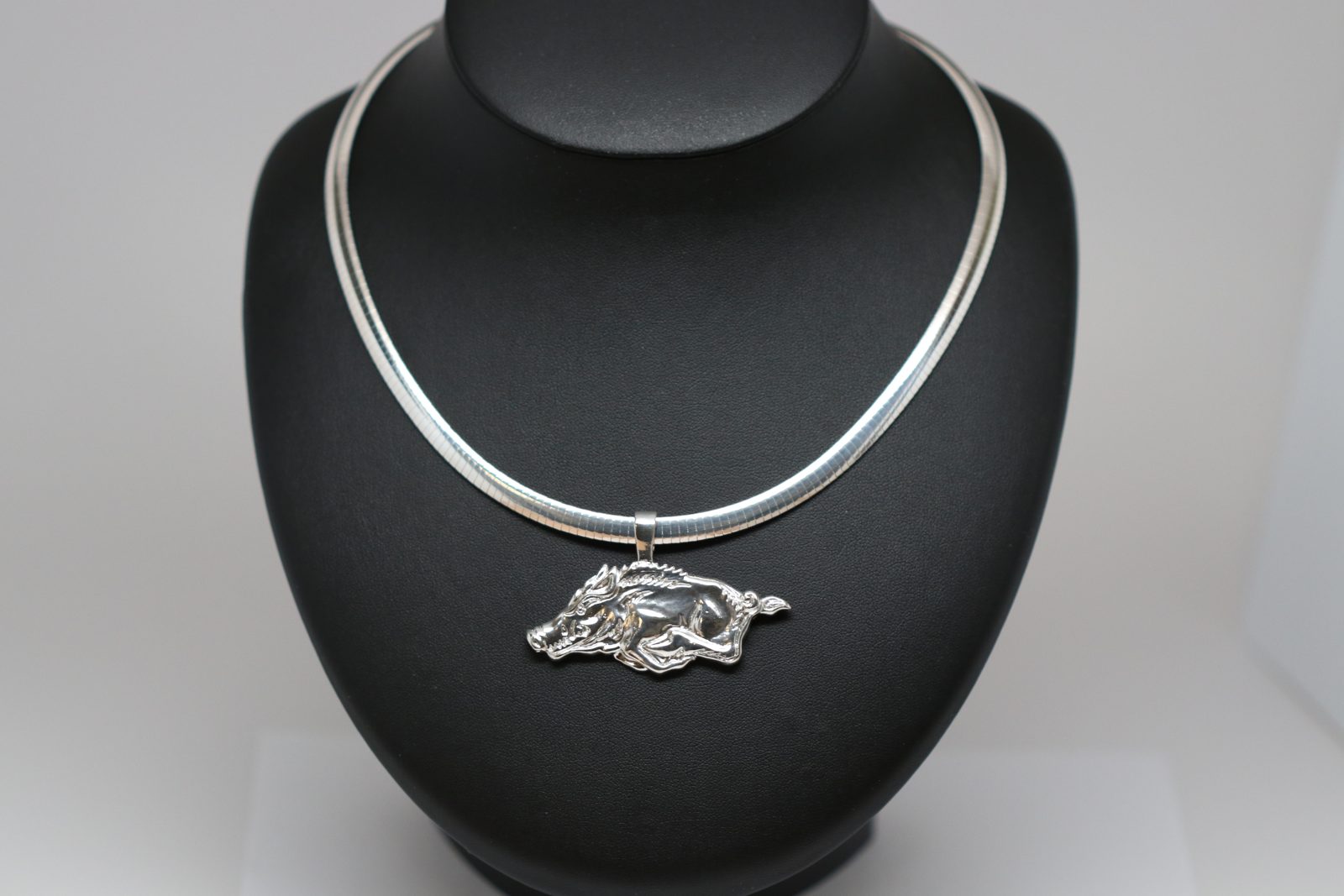 Support our Razorbacks with this fashionable pendant. This larger version of the razorback pendant is a great game day piece! It can be created in Silver, White Gold, and Yellow Gold.
