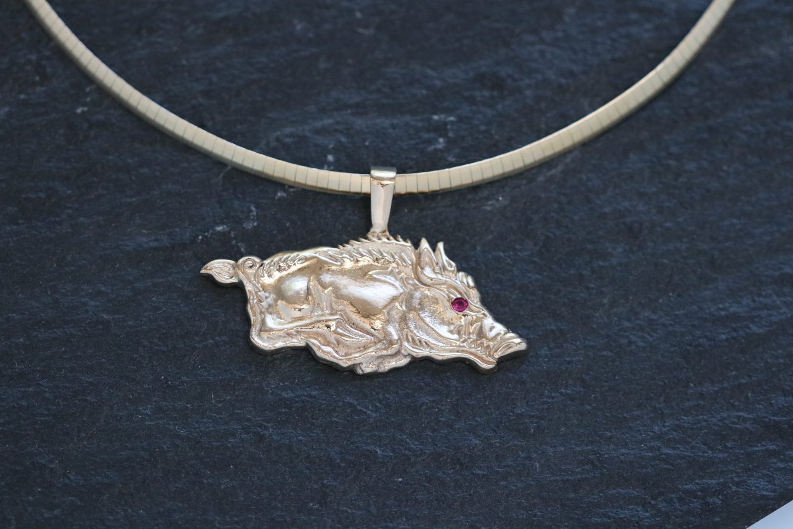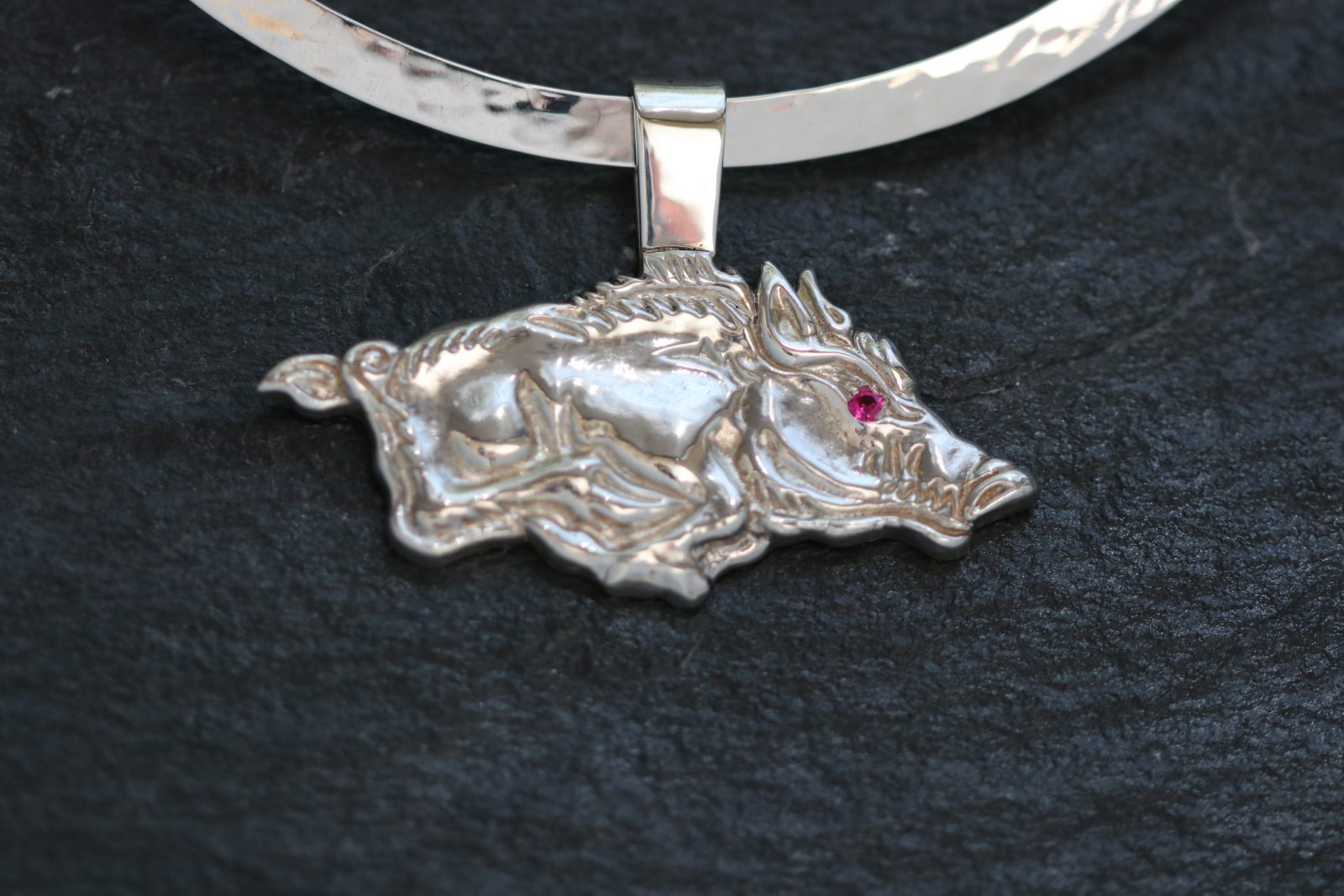 Support our Razorbacks with this fashionable pendant. This medium version of the razorback pendant is a fan favorite! It can be created in Silver, White Gold, Yellow Gold, Rose Gold and goes great with your game day gear! Add a ruby to the eye for that extra special touch.