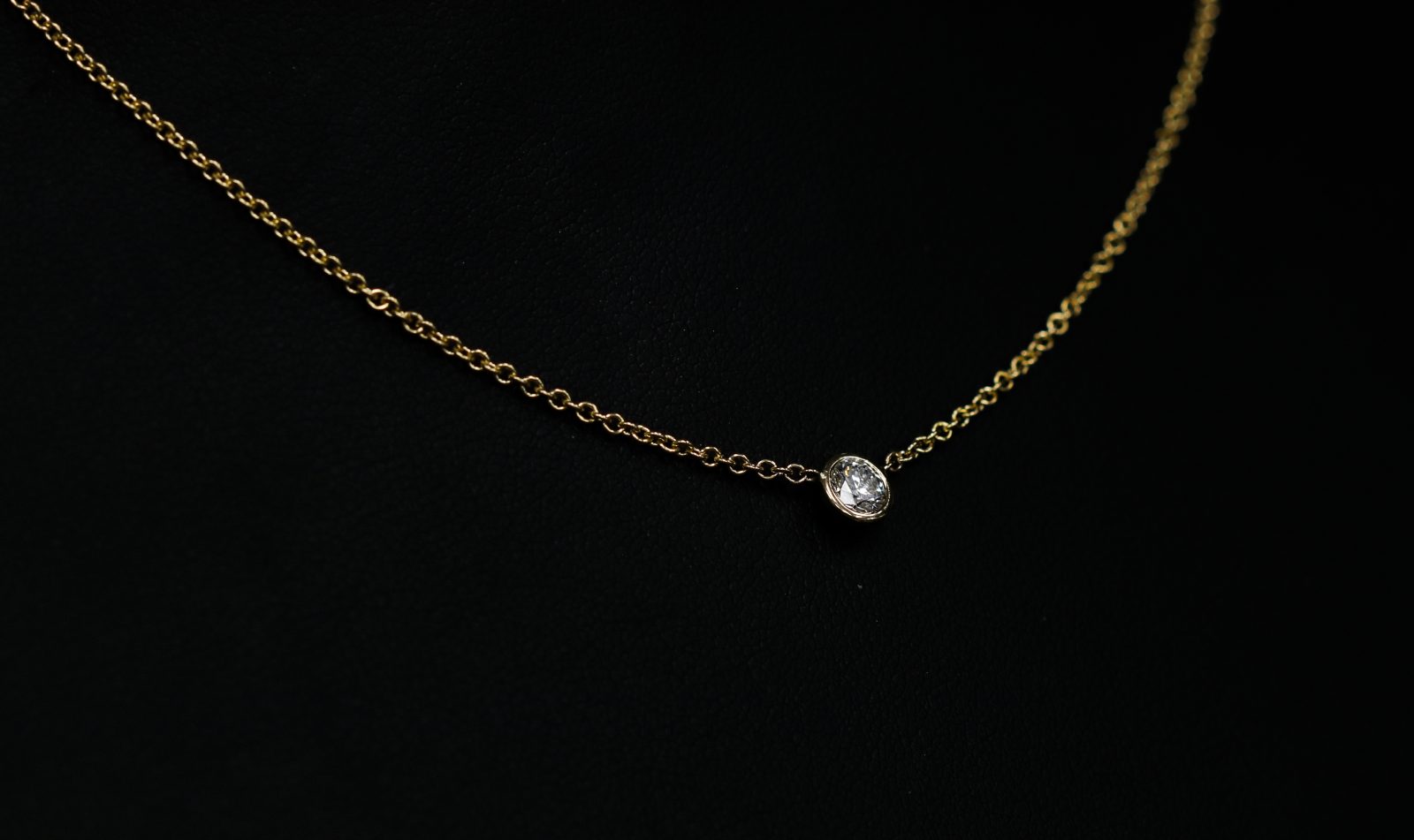 Showcased at the center is a 0.35 carat round diamond, prized for its timeless sparkle and exceptional fire. The diamond’s classic round cut creates a bright, eye-catching focal point that enhances the necklace’s warm gold glow.